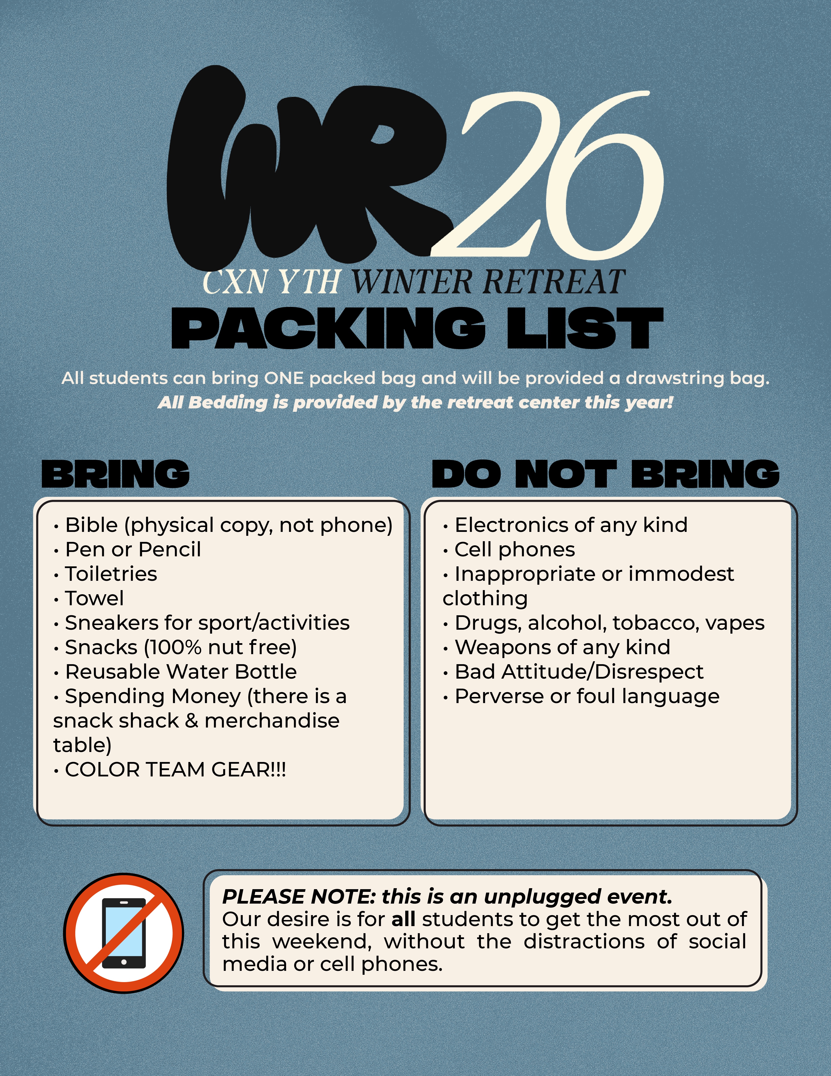 We want to make sure every student who wants to attend Retreat can. If you’re in need of financial assistance to attend retreat, please contact Pastor Carrie at carrie@cometoconnect.com.